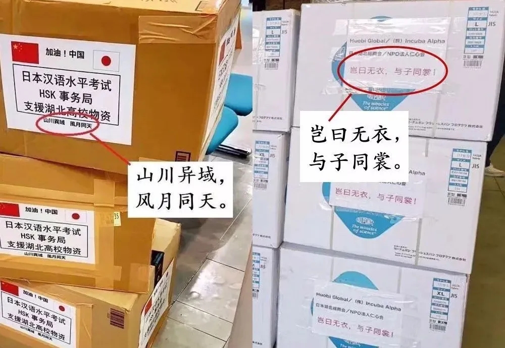 贴在箱子上的暖心鼓励,更是让很多人瞬间泪奔——“山川异域,风月同天”。