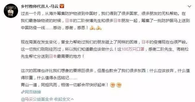 而我们的企业家代言人马云,也向日本捐赠了100万只口罩。