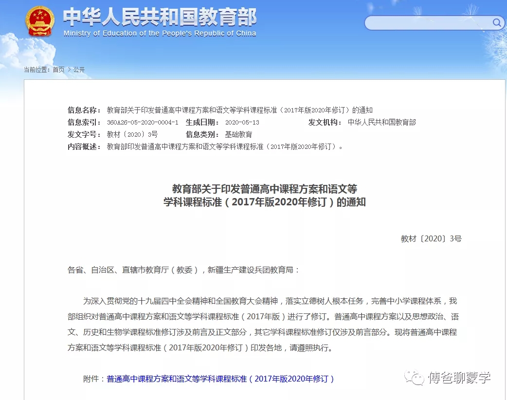 答:2020年6月3日,教育部发布《普通高中课程方案》(2017 年版 2020 年修订)与20门学科的《普通高中课程标准》(2017 年版 2020 年修订)。