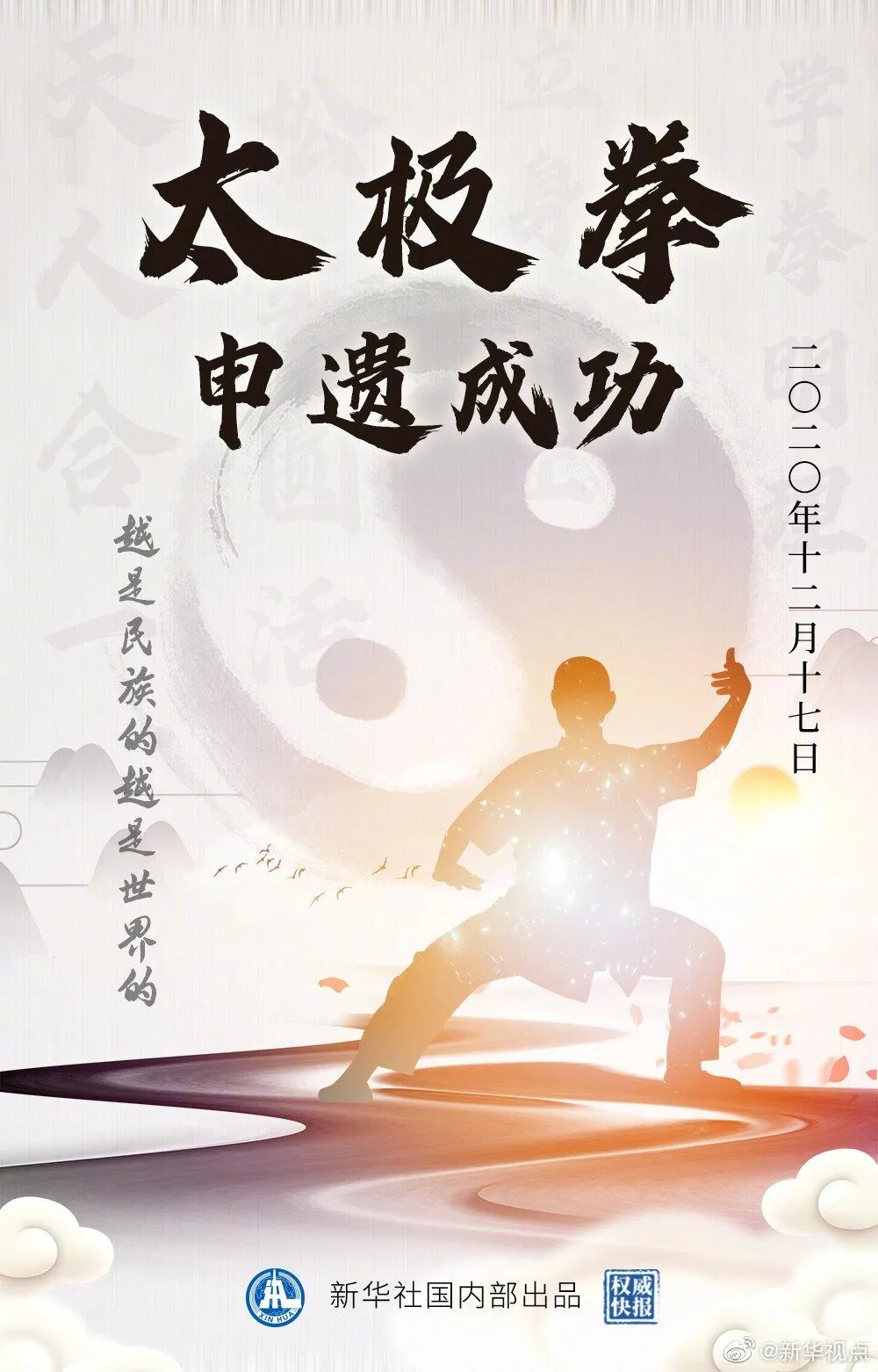 2020年12月17日,线上召开的联合国教科文组织保护非物质文化遗产政府间委员会第15届常会17日通过决议,将中国申报的太极拳列入联合国教科文组织人类非物质文化遗产代表作名录。