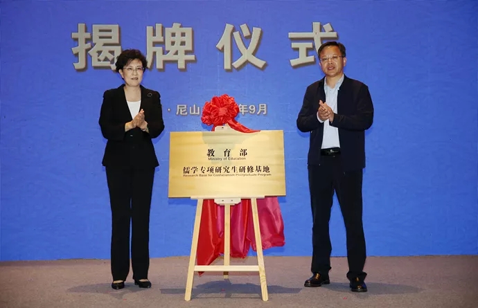 中国人民大学党委书记、尼山世界儒学中心理事会理事长、尼山世界儒学中心联合研究生院院长靳诺,山东省副省长王心富共同为研修基地揭牌。