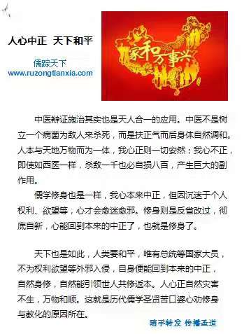 天下也是如此,人类要和平,唯有总统等国家大员不为权利欲望等外邪入侵,自身便能回到本来的中正,自然身修,自然前引领世人共修返本。人心正自然灾害不生,万物和顺。这就是历代儒学圣贤苦口婆心劝修身与教化的原因所在。