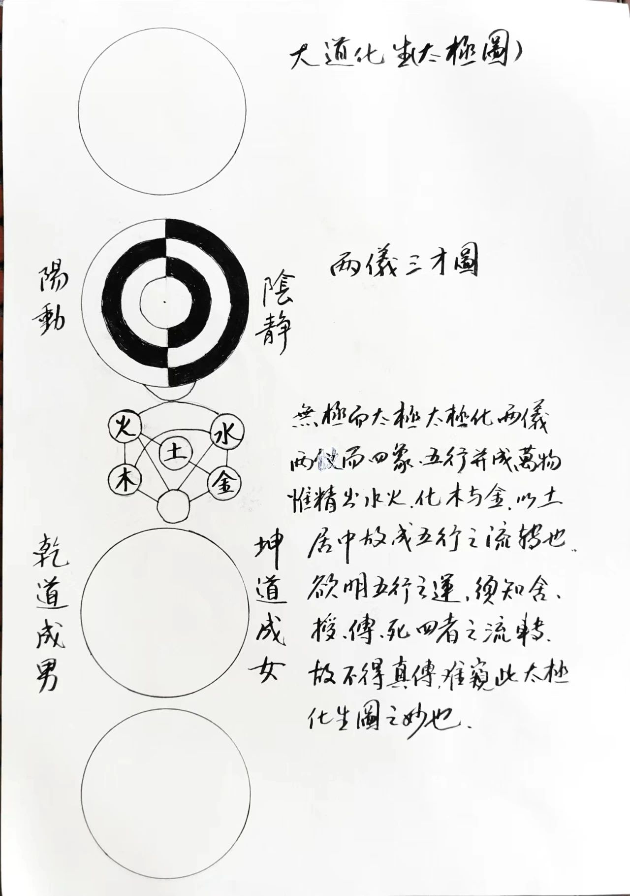 先说“大道化生图”。此图如无真传,不得真解,是看不懂的。1、此图先画一个大圆圈,此圆圈表示无极,是宇宙万事万物化生之大本体。2、紧接着是两仪三才图,此是万事万物各得天地阴阳之分的三才大象,此大象即如二程子所言:“冲漠无朕而万象森然已具”。3、下面接着便是动静、阴阳运转的五行图。此五行图最为难懂,须有三个分解图,即“水、火、木、金生成图”、 “五行舍、授、传、死图”和“五行环链图”一起看,才能看出其中的端倪。4、下面连接“水、火、木、金”的小圆圈便是“无极而太极”之处,此处即生生不息的“至善”之地。5、接着便是两个大圆圈,第一个大圆圈是“无极之真”而化生男女,最后一个大圆圈即“万化同寰”,回归大本体。