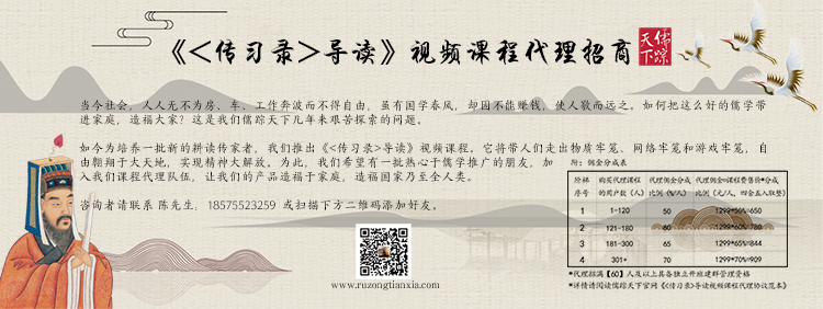 儒踪天下秉行“利以义取,情怀第一,课程质量第一”的原则。欢迎有识之士代理我们的儒学课程,代理佣金回报极其丰厚。截止目前,儒踪天下已推出5门语音网络课程:《三字经》《千字文》《孝经》《论语》《<诗经>选讲》;视频网络课程已推出2门:《<大学>心法》《<传习录>导读》),都施行透明的全国统一零售价。