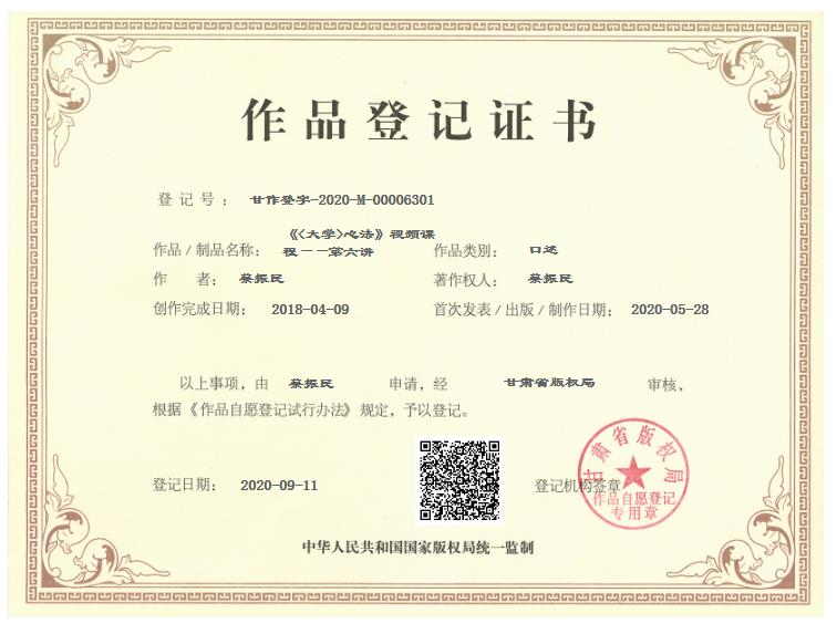 国家版权证书是按课程章节进行审批授予的,《<大学>心法》视频课程共计8课,即有8张版权证书。