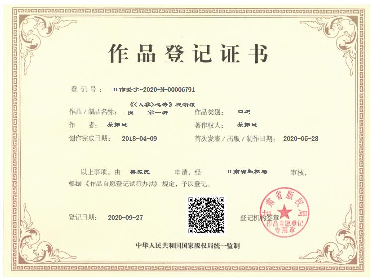恭喜儒踪天下蔡振民老师的“《<大学>心法》视频课程” 获得国家版权证书!