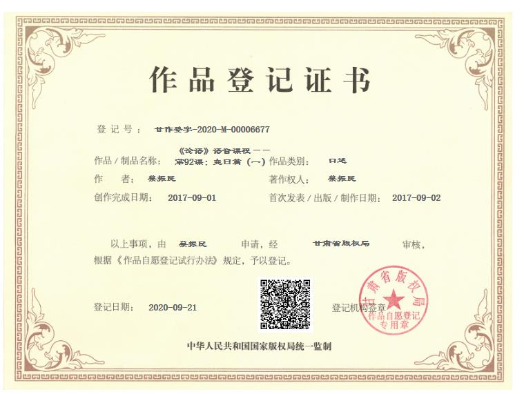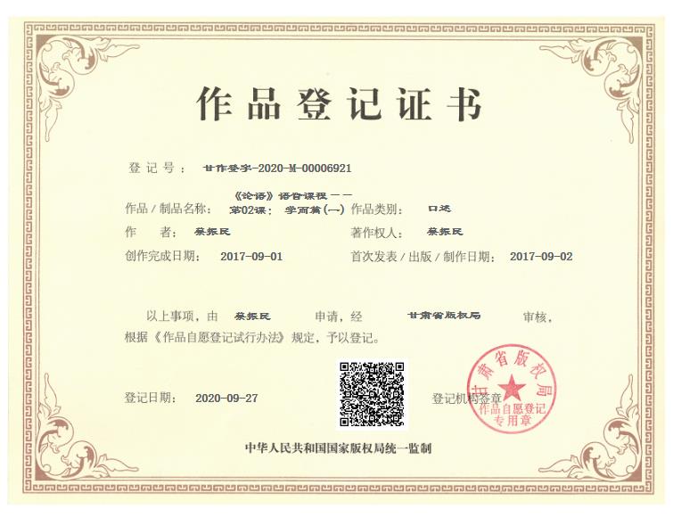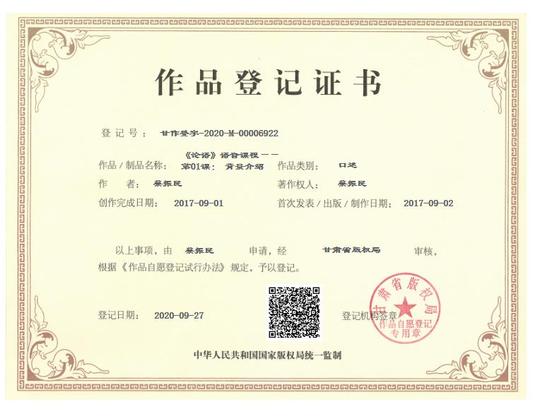 恭喜儒踪天下蔡振民老师的“《论语》语音课程” 获得国家版权证书!
