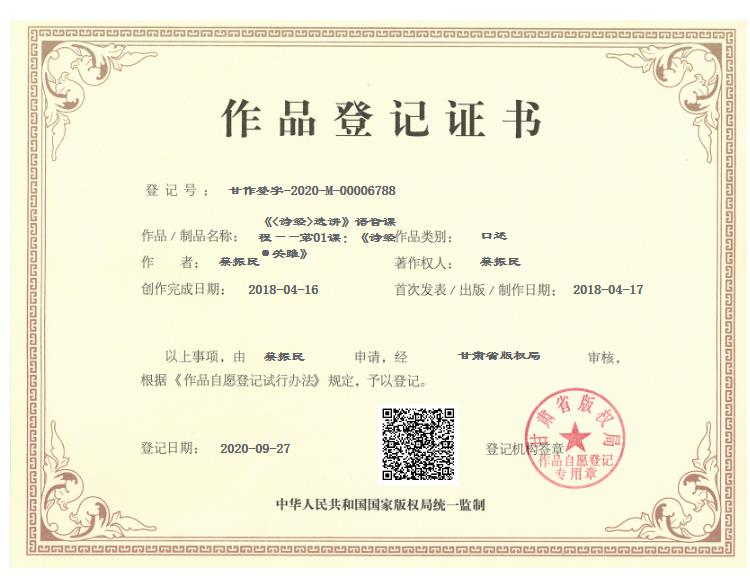 恭喜儒踪天下蔡振民老师的“《<诗经>选讲》语音课程” 获得国家版权证书!