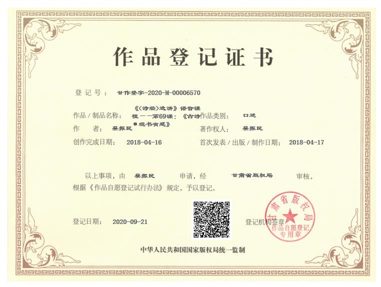 国家版权证书是按课程章节进行审批授予的,《<诗经>选讲》语音课程共计69课,即有69张版权证书。