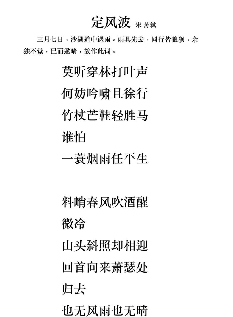 苏轼因乌台诗案而被严刑拷打。他出狱后带着一大家子20多口人来到湖北黄州。初到黄州,苏轼便脱去了文人的长袍方巾,穿上农民的芒鞋短褂,回归田园生活。一天,苏轼与几个朋友相约出游,不料天降急雨,众人都纷纷跑着躲雨去,只有苏轼一人在雨中拄着竹杖淡定前行。过后,苏轼写下这一首“定风波”。