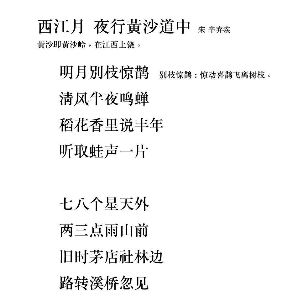 明月能惊鹊?分明是大热天一片农忙,人来鸟惊枝嘛!清风半夜鸣蝉不正是夏夜的热闹么?蛙声一片庆丰年,怎不热闹?诗歌下阕转写夏天独有的烦闷天气,在压抑的夏夜,七八个星却闪在天外,而山前又飘着几滴闷雨。这夏夜,被贬于江西上饶的辛弃疾,怎不也牵出几分烦忧与无奈?如有啤酒,他定会来几瓶冰冻的,解解烦。于是,他一路寻去,在溪桥转弯处,找到了那个熟识的茅棚小店。