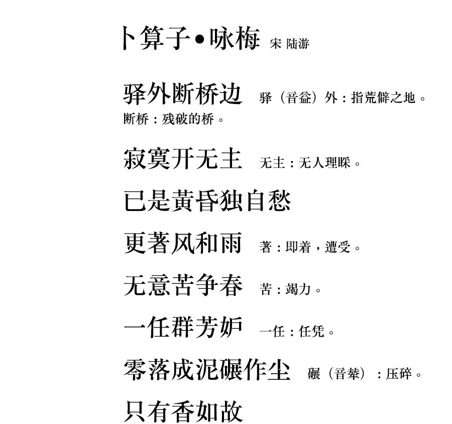 驿外,一个偏远寂静冷落的地方;断桥,一个残缺、孤单、无人理睬的角落。就在这驿外断桥边,有一梅花,寂寞开无主。她没有主人可依靠,孤零零地开着。作者以梅花自比,仅仅两句十个字便把自己饱受排斥、冷落、孤单无助和自怜自爱的凄凉一生写尽了。已是黄昏,比喻作者已经走到人生的暮年,回忆可怜的一生,本已万分愁肠谁能知?---独自愁而已。然而,祸不单行,雪上加霜---更著风和雨。于是回头反省,为何如此?难道梅花是不自量,是刻意去和其他花争妍斗艳?非也,梅花,俏也不争春,只把春来报。---无意苦争春也!谁都不愿意劳心竭力去争什么春光,梅花自有梅花命,梅花本来就应该如此绽放!爱妒忌就妒忌去吧!--- 一任群芳妒!梅花于是最后郑重地向世人宣说:即使被蹂躏成泥,被碾压成土,梅花的清香仍一如既往,散发人间---零落成泥碾作尘,只有香如故。