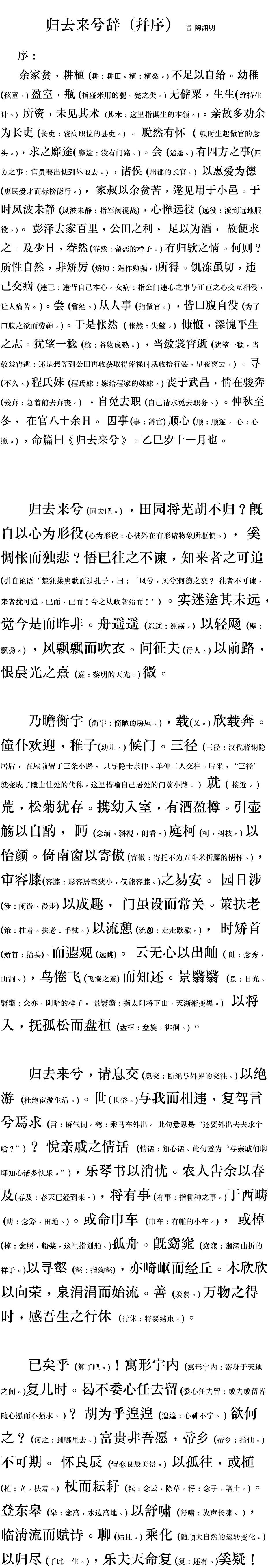 陶淵明曾經當過幾次官,這個小賦是他最後一次辭官時寫的。他寫此文時安排有兩條線索。一是以自責自悔--安于田園--樂天知命為性情線索,另一個是以辭官(決心、歸途)——回家(家居生活、庭院獨趣)——出遊(訪親、耕讀、出遊、怡情)為順序,寫成了這篇傳頌千古的美文。