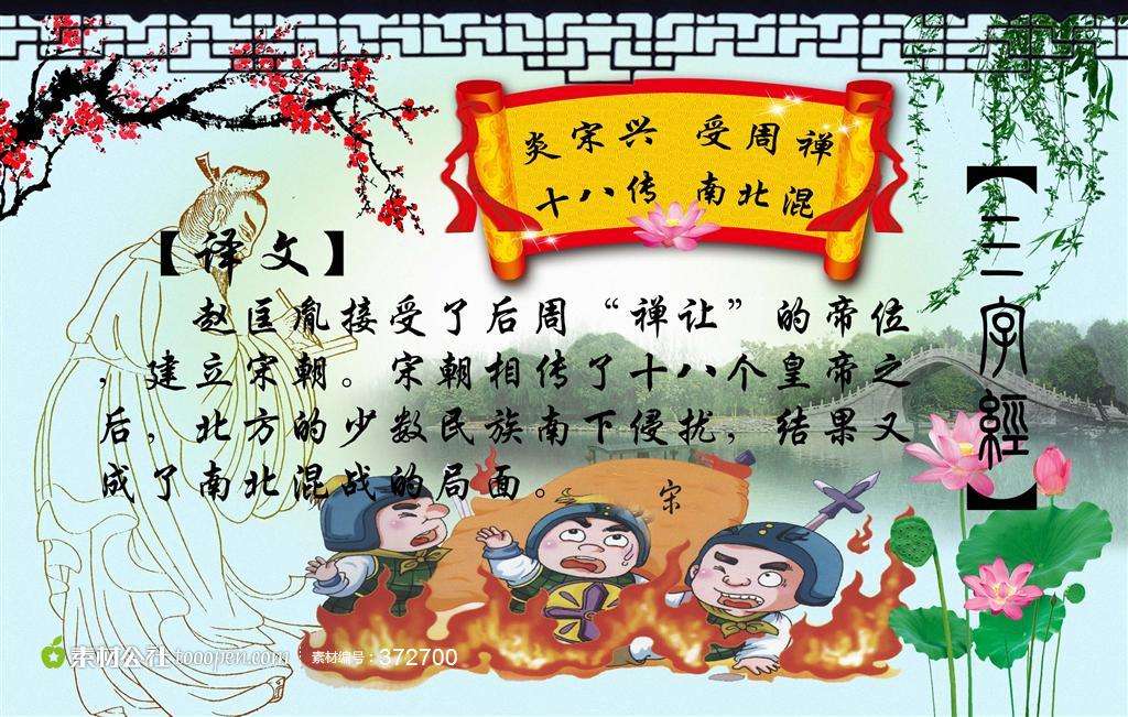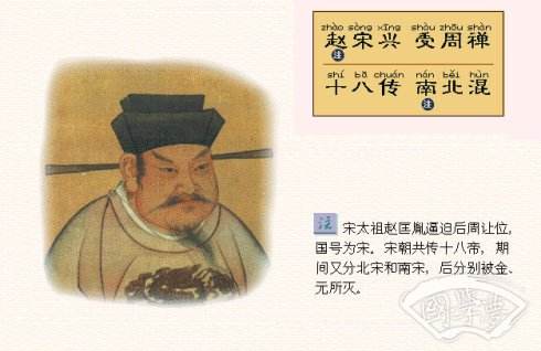经历过五代十国以后,中国的历史就进入宋朝。《三字经》的作者王应麟也是宋朝人(他生于南宋时期),是南宋官员。后来元朝进入,宋朝灭亡。王应麟隐姓埋名在元朝生活了二十年左右。这个时候王应麟对宋朝是非常怀念的,所以写到宋朝的时候,他就用上了“炎宋兴”这一笔。