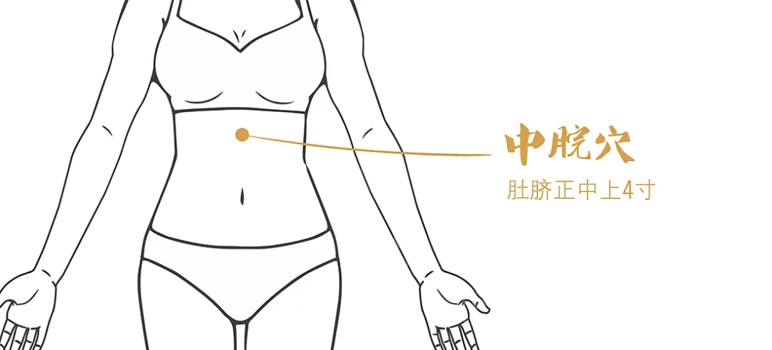 中脘穴在身体正中,肚脐向上4寸处,专治胃寒、胃痛、呕吐、泄泻。用食指和中指并在一起点按1分钟,中脘穴处会有热热的感觉。经常点按,可以治胃痛,缓解紧张、焦虑。