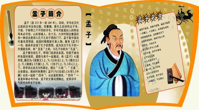 孟子(约公元前372年-公元前289年),名轲,战国中期鲁国邹人(今山东邹城市东南部人)。是著名的思想家、政治家、教育家,孔子学说的继承者,儒家重要代表人物。相传孟子是鲁国贵族孟孙氏的后裔,幼年丧父,家庭贫困,曾受业于子思的门人。学成以后,以士的身份游说诸侯,企图推行自己的政治主张,到过梁(魏)国、齐国、宋国、滕国、鲁国。当时几个大国都致力于富国强兵,争取通过武力的手段实现统一。而他继承了孔子“仁”的思想并将其发展成为"仁政"思想,被称为"亚圣"。