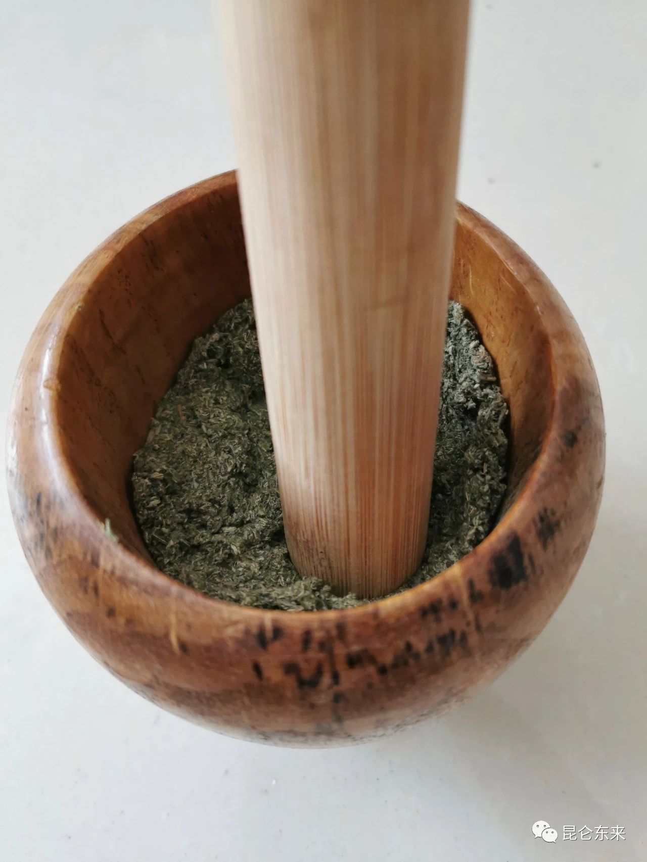 为了达到古法艾灸(大约黄豆粒大小即可)用艾绒的标准,我们经过反复捶打和手搓之后,还要在木臼中再多次捶打和提纯。