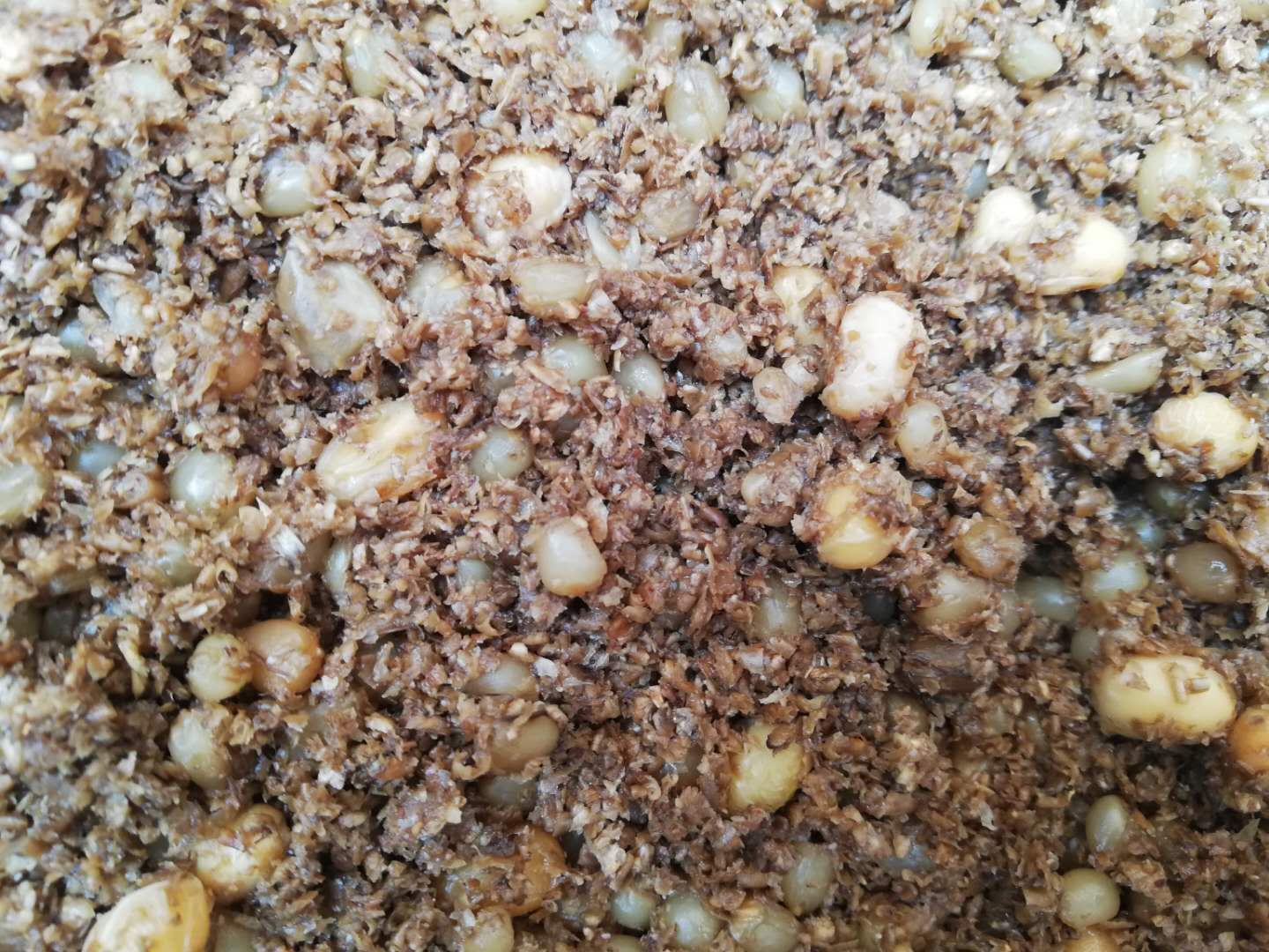 把煮好的谷子,煮烂了的麦子,再加上麦子磨成的大麸,即把他们这些原料全部加上,再加上之前发酵的醋头子,按比例兑在一起的图。