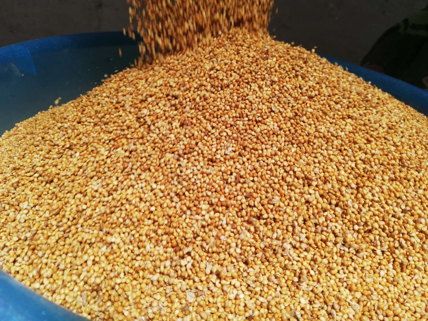 手工挑选谷子、筛选谷子,把谷子弄干净了,主要要煮熟。要煮熟的话,就是按比例往里边兑谷子(这边种的谷子,做小米儿把谷子一碾米就碾成小米儿的那个谷子)。