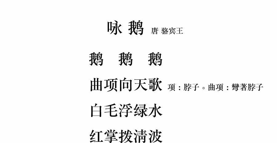 鵝、鵝、鵝,仿鵝之聲以名鵝之形象,無半點臆造,渾然天成。曲項,鵝之威武,向天而喧其歌也;紅掌,鵝之閒情,撥水弄波,屹然獨立也。鹅、鹅、鹅,或向天抒懷,或從容涉世,無须惊涛骇浪,只在清波綠水間。