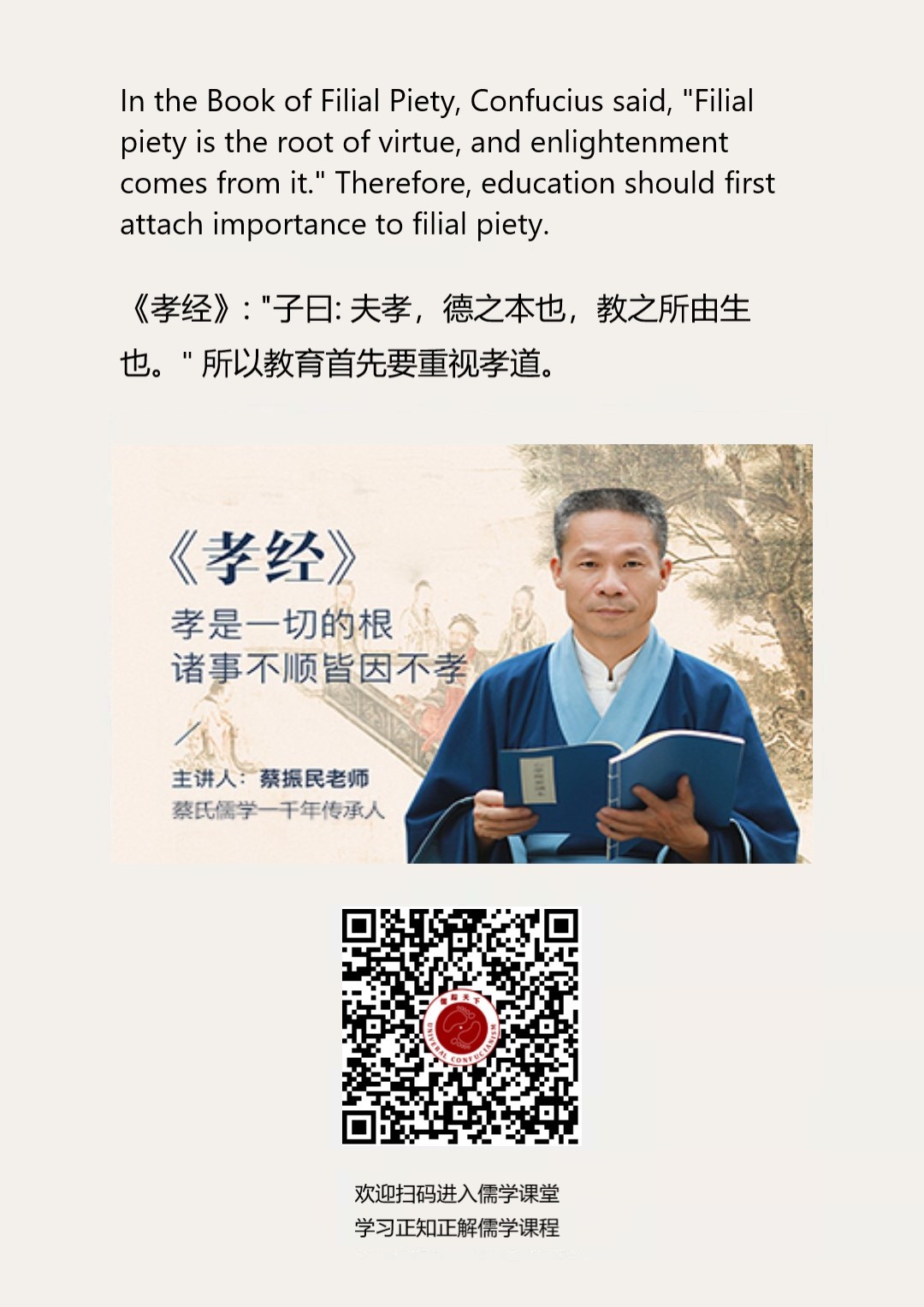 Confucianism English 83 | 《孝经》: "子曰: 夫孝,德之本也,教之所由生也。" 所以教育首先要重视孝道。