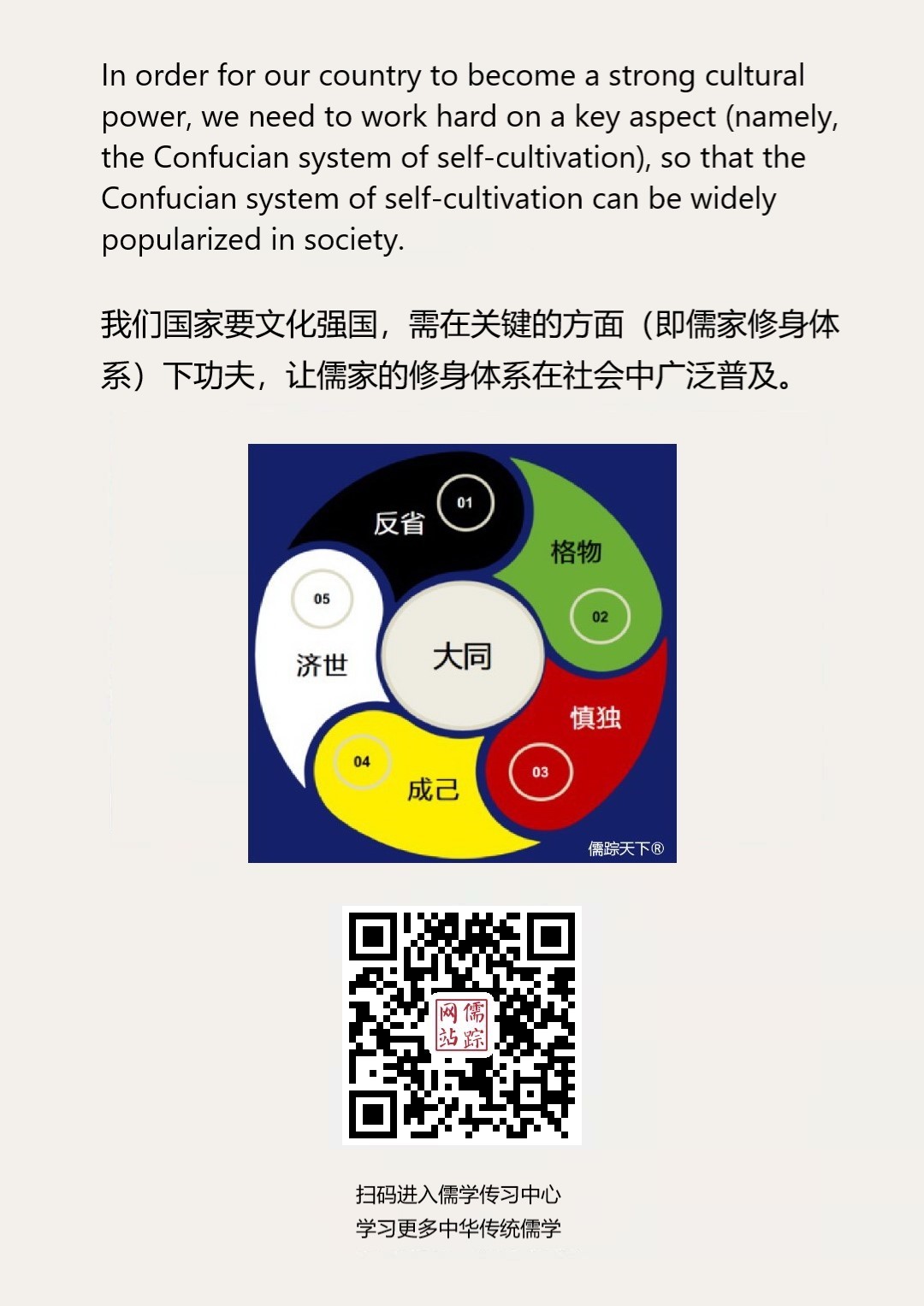 Confucianism English 111 | 文化强国需在关键的方面(即儒家修身体系)下功夫并在社会中广泛普及。