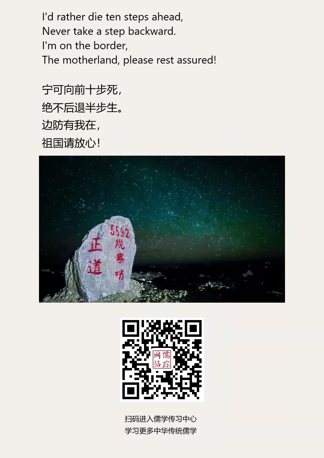 Confucianism English 143 | 宁可向前十步死, 绝不后退半步生。 边防有我在, 祖国请放心!