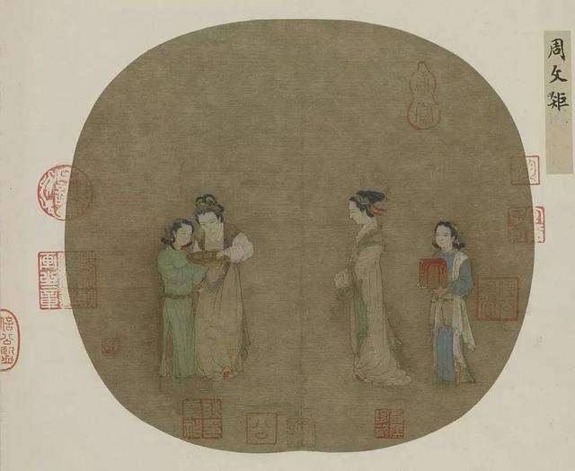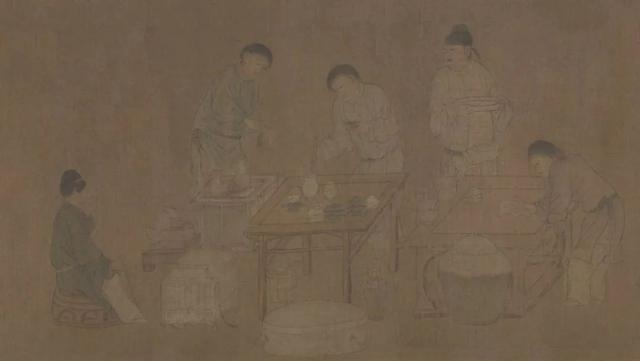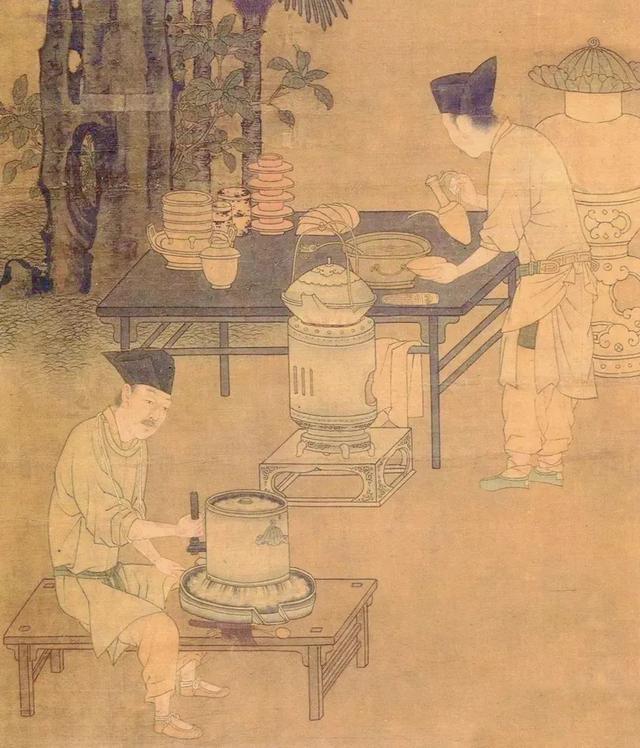 ▲宋徽宗赵佶《文会图》,前方的几个人正在制茶。