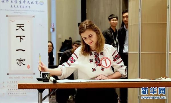 5月25日,第18届“汉语桥”世界大学生中文比赛乌克兰赛区决赛在乌克兰首都基辅举行,一名选手在才艺表演环节进行书法表演。 新华社记者 陈俊锋摄