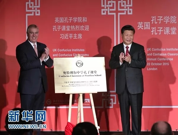 2015年10月22日,国家主席习近平在伦敦出席全英孔子学院和孔子课堂年会开幕式。这是习近平和约克公爵安德鲁王子共同为全球第1000所孔子课堂——奥特利尔中学孔子课堂揭牌。新华社记者 庞兴雷 摄