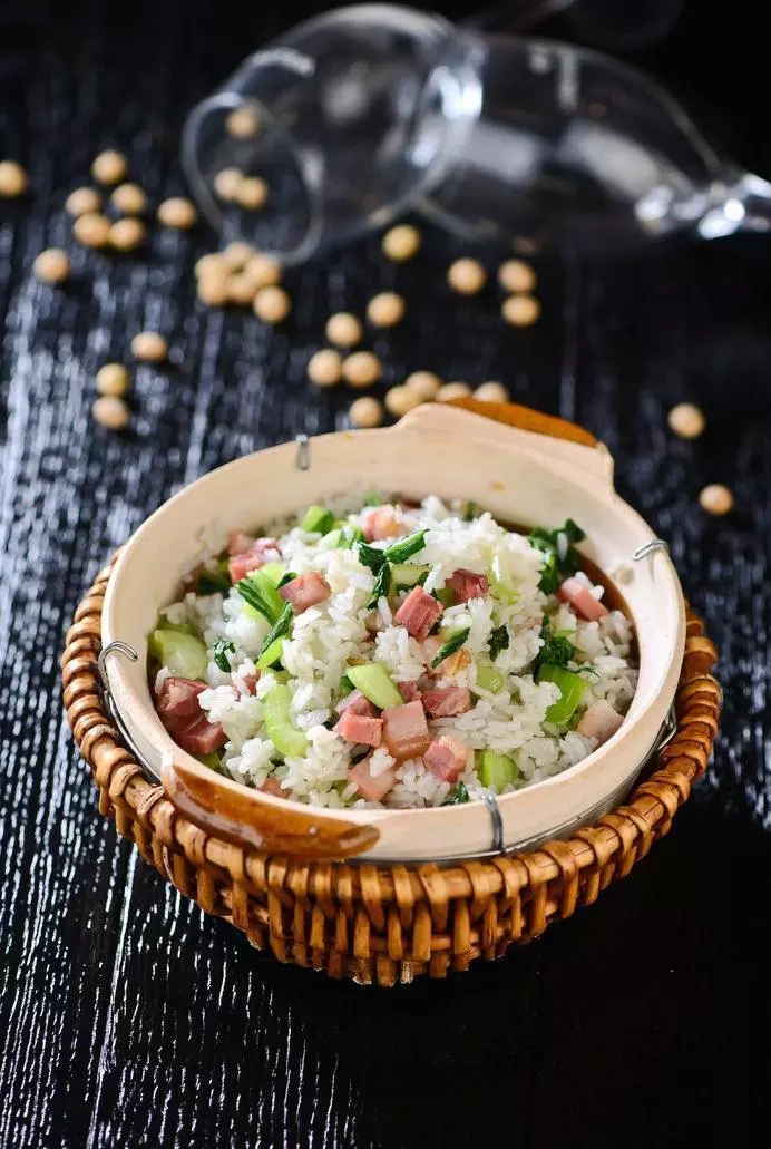 菜饭里的配料有矮脚黄青菜、香肠、板鸭丁,再配上点儿咸肉片、生姜粒、糯米,有的人还会在菜饭里埋一勺猪油,吃饭时筷子一拌,鲜香得很。