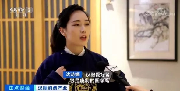 汉服爱好者 沈诗婳:我个人是比较喜欢圆领袍的,就好比我身上这一件。它是唐制的圆领袍,在隋唐时期,这样的圆领袍是可以男女共穿的。