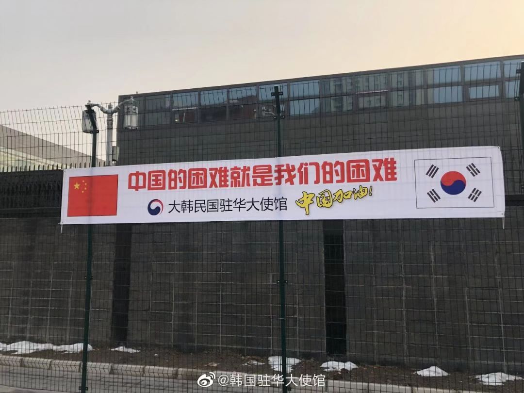 更惹人泪奔的是,他们把韩国总统说的话,做成了横幅,让每一个路过的中国人,都能感受到这份温暖的鼓励——“中国的困难,就是我们的困难。”