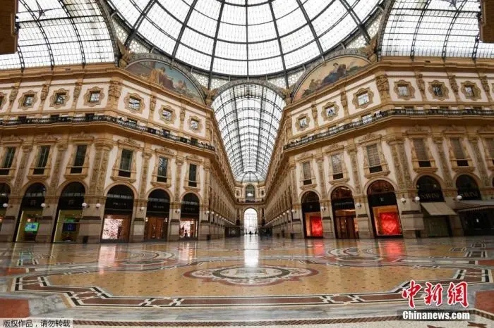 资料图:当地时间3月12日,意大利米兰市中心空无一人的维托里奥·埃马努埃莱二世购物中心。为遏制疫情蔓延,意大利总理孔特11日晚宣布,关闭全国除食品店和药店以外的所有商铺。