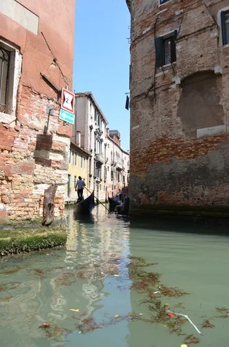 拥挤,甚至还会“堵车”的贡多拉,在窄窄的河道里穿梭,河道里的淤泥被不停的翻搅上来,垃圾漂浮在河面。