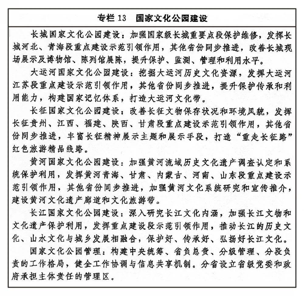整合长城、大运河、长征、黄河、长江沿线等重要文化资源,强化文物和非遗真实完整保护传承,重点建设管控保护、主题展示、文旅融合、传统利用等主体功能区,系统推进保护传承、研究发掘、环境配套、文旅融合、数字再现等重点基础工程,实施公园化管理运营,形成具有特定开放空间的公共文化载体,集中打造中华文化重要标志。