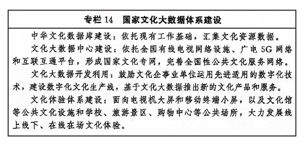 加强规划引导和政策指导,打通各层级公共文化数字平台,打造公共文化数字资源库群,建设国家文化大数据体系。统筹推进公共文化数字化重点工程建设,把服务城乡基层特别是农村作为着力点,不断缩小城乡之间的数字鸿沟。建设智慧图书馆体系和国家公共文化云,建设智慧博物馆,打造智慧广电、电影数字节目管理等信息数字化服务平台。积极发展云展览、云阅读、云视听、云体验,促进供需在“云端”、“指尖”对接。推进农家书屋数字化建设,建立智能化管理体系。