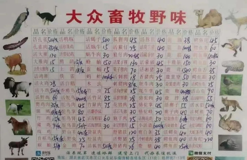 在新型冠状肺炎疫情爆发之初,一张来自武汉华南海鲜市场的野味菜单同时在网上流传。