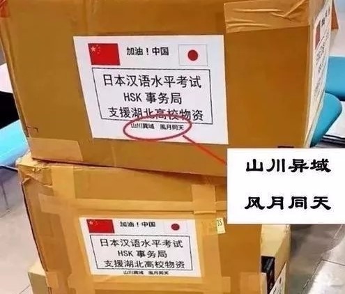 一方有难,八方支援。疫情面前,很多国家都向中国伸出了援助之手,令人动容。因为大家都关注到了一个细节,那就是日本的捐赠物资上面很多都写着诗句。在物资包装箱上写中文诗,最早是从日本汉语水平考试(HSK)事务局开始的。2月初,武汉收到了日本汉语水平考试事务局捐赠的一批口罩,包装箱上除了写有“加油中国”的字样,还写着八个小字:“山川异域,风月同天”。意思是,虽然我们不在同一个地方,不享有同一片山川。但当我们抬头时,看到的是同一轮明月。这八个字感动了中国网友,也引发了大家对它背后故事的探究。