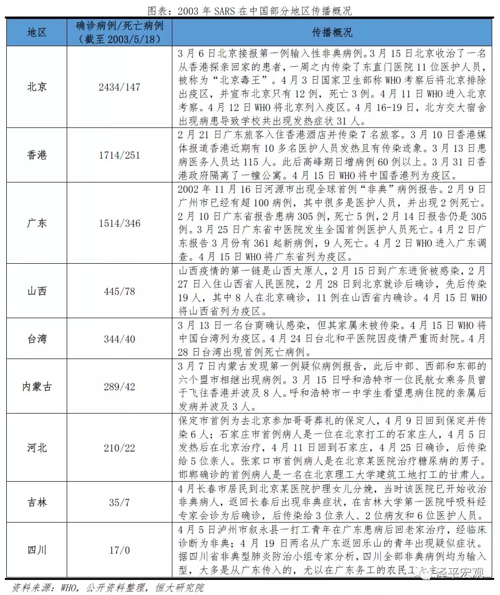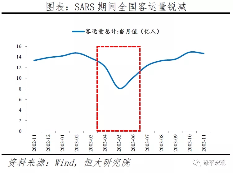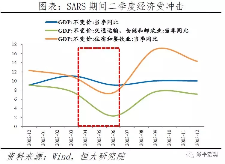 SARS流行期间民生经济遭遇短暂冲击。疫情期间政府限制人员流动,叠加民众自主减少外出和消费活动,一定程度阻碍了经济发展。2003年4-6月中国客运量明显减少,其中5月客运量减少至8.09亿人,仅是2月的54.9%。2003年全国二季度GDP增速从11.1%下滑至9.1%,其中运输物流业和住宿餐饮业下滑明显,分别降至2.3%和7.4%。然而疫情过后经济快速恢复,住宿餐饮业甚至出现短暂爆发,GDP增速恢复至10%。