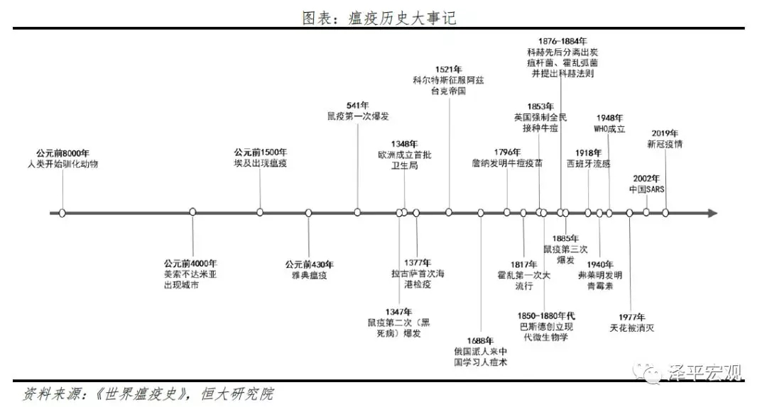 回顾人类历史,瘟疫是与饥荒、战争等相并列的重大灾难,黑死病、天花等瘟疫均造成数以亿计的人口死亡,历史惨剧曾多次上演。面对瘟疫的威胁,人类社会在长期的应对中既有很多惨重的教训,也积累了宝贵的经验和方法,文明在一次次的危机中不断前进。19世纪以来公共卫生体系的完善、现代微生物学的发展及医学技术的进步使得多数传染病得以被控制,人类依靠文明和科学取得对瘟疫的阶段性胜利。但展望未来,病毒的快速进化、人类与动物的接触、城市规模及人口密度的提高、人员流动的加快等将使得新的瘟疫不断产生,并将持续挑战政府的社会治理及应急防疫能力、国际合作机制等,人类距离彻底战胜瘟疫仍然任重道远。