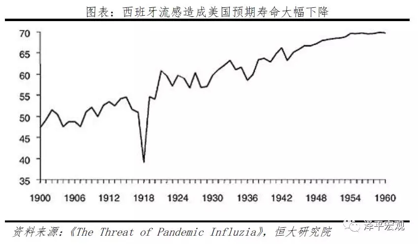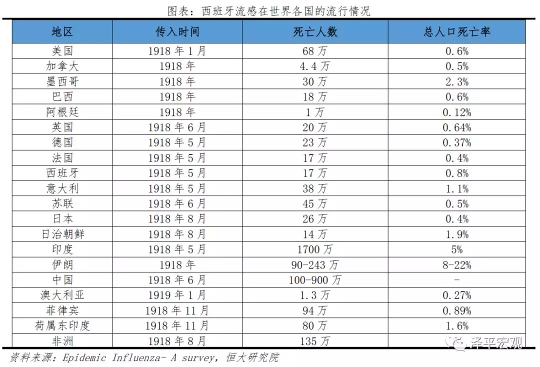 事后来看,1918年西班牙流感具有流行时间短、传播范围广、感染人数及死亡人数多、青壮年死亡率高等特点。流行时间方面,这场流感始于1918年春季,历时仅2年,分别在1918年春季、1918年秋季、1919年冬季至1920年春季三次大流行,其中第二次最为严重;传播范围方面,西班牙流感基本覆盖全球所有人类聚集地,包括北极和太平洋群岛,其中一些北极圈的爱斯基摩人部落死亡率超过80%,很多村庄成为废墟;感染人数及死亡人数方面,西班牙流感死亡患者主要死于肺炎,尽管西班牙流感的致死率远低于黑死病、天花等著名瘟疫,但由于感染者基数大,造成了同样严重的死亡规模,经统计和估算,西班牙流感感染人数达到5亿,占全球人口的三分之一,而死亡人数在5000万-1亿人之间,人类历史上仅次于天花;死者年龄结构方面,16-40岁的青壮年占一半以上,原因是青壮年的较强免疫应答造成了更严重的细胞因子风暴,青壮年的死亡造成美国预期寿命下降约12年。