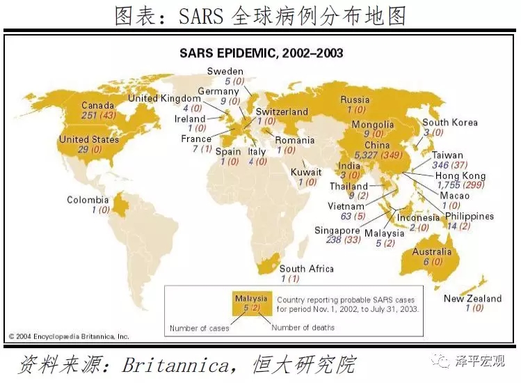 2003年2月下旬,一名常驻上海的美国商人在途经中国香港到达越南河内后确认染病,并传染了多名当地医疗人员。常驻河内的WHO医生向WHO通报了病情,3月12日WHO发出了全球警告,3月15日WHO正式将该病命名为SARS。之后SARS从东南亚传播到澳大利亚、欧洲和北美。7月,全球SARS确诊和疑似病例数均不再增长,疫情基本结束。根据WHO数据,截至2003年8月,中国内地累计报告SARS病例5327例,死亡349例;全球累计患病8422例,死亡916例。