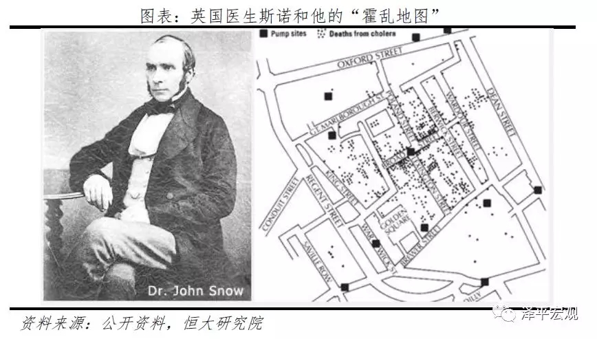 早期面对未知的疾病,误判其传染性造成了霍乱大流行的后果。第二次大流行期间,欧洲人面对未知的疾病,就其“传染性”发生争论,但大规模检疫和隔离措施,与当时的现代化建设、殖民统治、重商主义等发展思路相矛盾,因此社会主流观点不愿承认其传染性,没有实施防疫措施,相关医学研究进展缓慢,导致疫情大规模扩散。1855年英国医生通过一张“地图”发现水是霍乱的传染源,从而有效控制了疫情传播。19世纪中叶,法国、德国、意大利等欧洲科学家努力查找霍乱病原体,但进展有限。1854年英国伦敦爆发区域性霍乱,次年英国医生斯诺通过流行病学和统计分析,绘制了病人居住地地图,认为病人密集度高的区域可能是病源所在地,并认定当地的一口水井是罪魁祸首。斯诺将结论上报政府,伦敦政府听取其建议封了水井,使发病人数大幅减少。