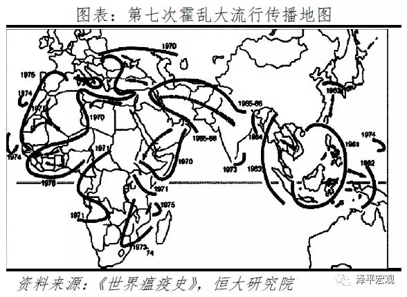 广义上,1961年开始的第七次大流行至今仍在继续,霍乱从印度尼西亚向周边地区蔓延,逐步波及140多个国家和地区。根据WHO数据,1961-1992年霍乱流行期间全球患者数量超过280万人;至今全球平均每年新增霍乱病例约130-400万例,死亡约2.1-14.3万例。