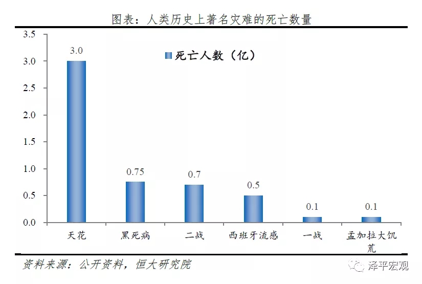 黑死病削减了欧洲30-50%的人口,天花导致3亿人死亡,西班牙流感致死破5千万,霍乱至今每年仍然夺走几百万生命……宏观上是数字,微观上是多少家庭的悲欢离合。瘟疫对经济的冲击长期来自人口削减对生产力的破坏,短期来自商贸活动停滞带来的直接影响。然而,我们难以准确估计其真正影响,因为没有人知道“假如没有瘟疫,世界会发生什么”。同时,天灾背后的“人祸”也让人刻骨铭心,欧洲中世纪黑死病导致的犹太人被迫害和屠杀,1918年西班牙流感导致医院瘫痪,2001年恐怖主义散播炭疽细菌引发骚乱,2003年SARS导致板蓝根脱销,人心的恐慌与猜疑、社会的动荡与不安随瘟疫一幕幕上演。遥远的历史显得模糊,冰冷的数字缺乏震撼,只有当我们亲身经历的时候才深感瘟疫的残酷。
