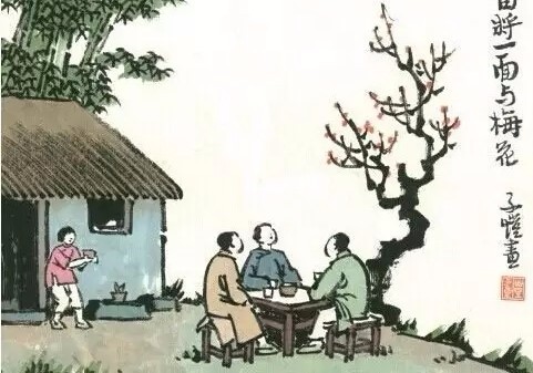 三位好友,小院闲坐,大家品茗闲话,且留一个位置与小院盛开的梅花,着实雅事。