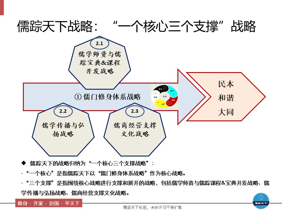 -“一个核心”是指儒踪天下的以“儒门修身体系战略”,作为核心战略。