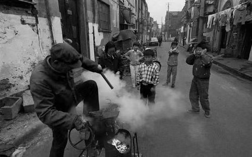 炸弹一样黑地爆锅在红红的火焰里旋转着,要等到时间才能“爆炸”,十几个孩子兴奋地围在一边,拾着吃着,说着笑着,遇到这种机会,有的孩子会一天都守在这儿,把免费的包谷花当饭吃。