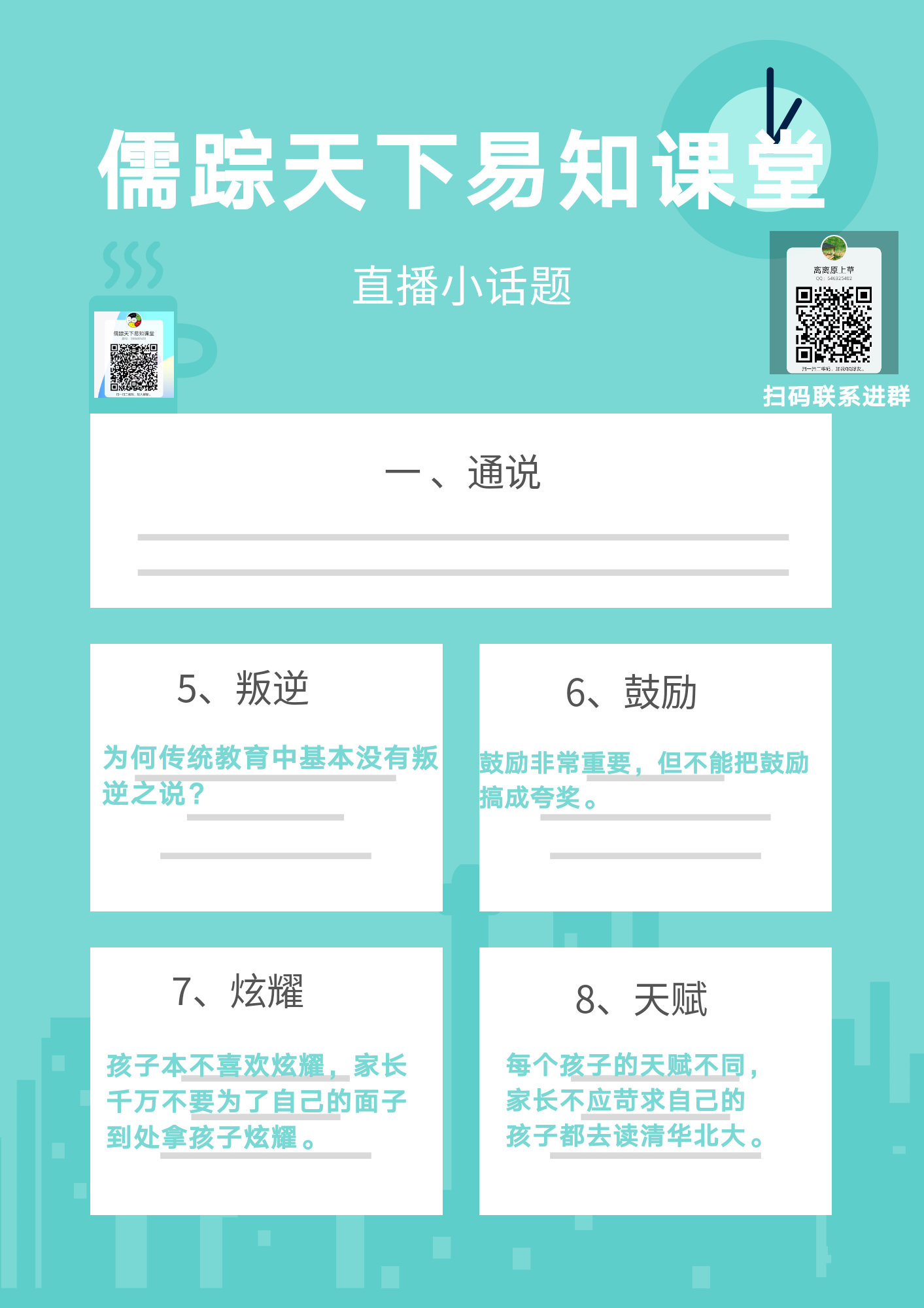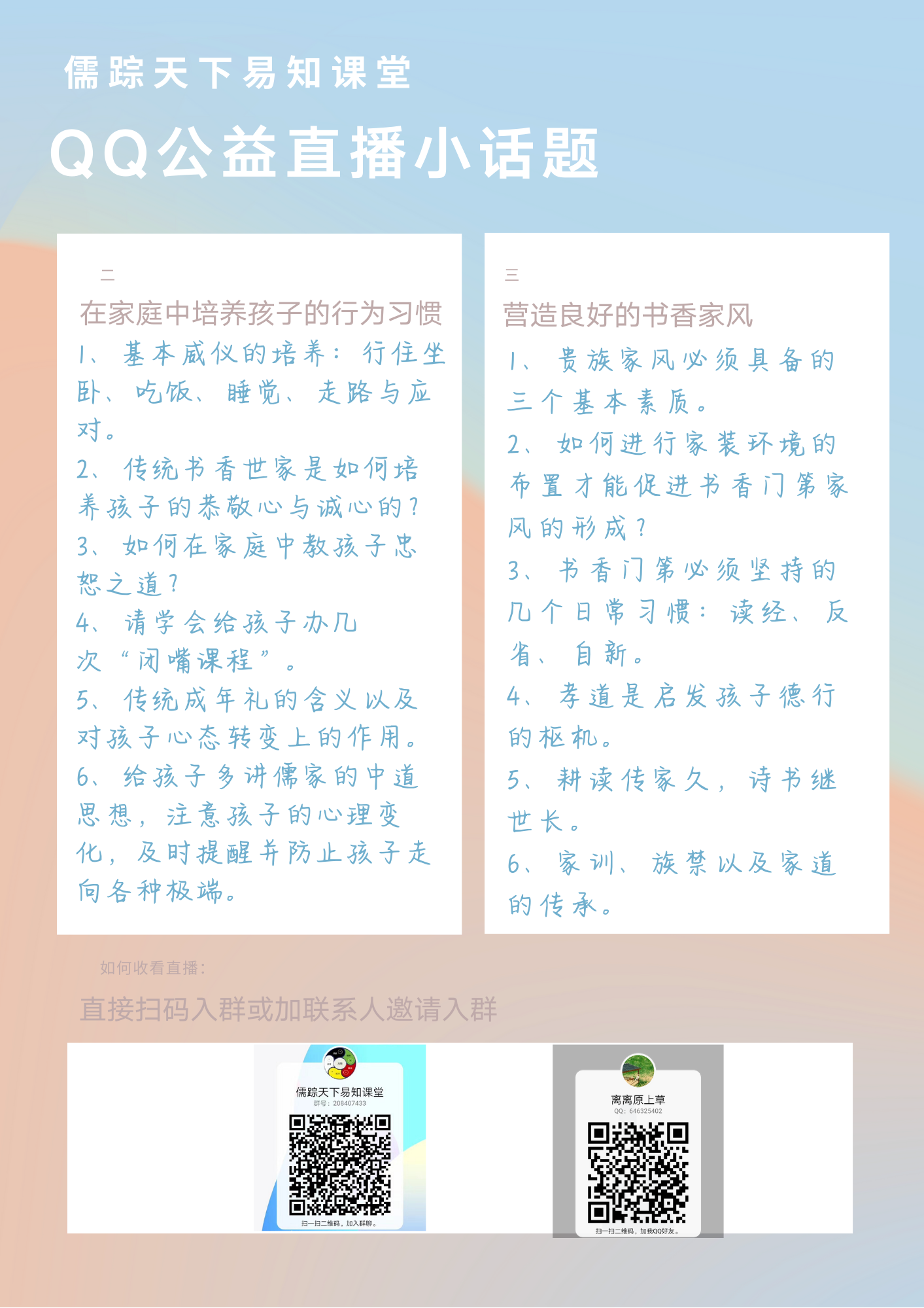 好消息!儒踪天下易知课堂,孩子教育和家庭家族文化专场,今天正式QQ直播,开课啦!欢迎扫码进课堂!